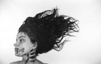 Too often over-sexualization leads women and girls to become victims. Kelly Blevins’ “Ghosts” takes us there. Describing her painting she explains, “The hand of a ghost across the neck represents physical, mental and emotional abuse and how it becomes a permanent imprint in us.”