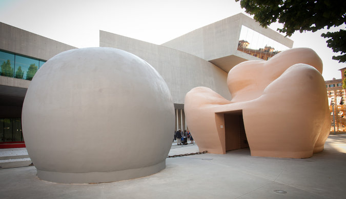 The chained UP chair by feminist artist Gaetano Pesce symbolizes servitude. Take a walk inside and you will see photographs and computer monitors asking questions like: