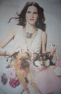 Immediately across the page from this photo is a full page Lord & Taylor ad of a beautiful white woman with long flowing dark hair, green eyes, perfect lips and two ears from which dangle long bejeweled earrings. She is arrayed in such opulence—necklace, pendant, bracelets, a giant opaline or turquoise ring, that the contrast with the Congolese woman is shocking. The juxtaposition of the two images is heightened by the fact that the Congolese woman wears a simple hand-crafted red and black blouse whereas the model wears what looks like an expensive hand-knitted ivory-colored chemise over a pink lace skirt. She holds in each hand a knitted handbag (“only $89”), each covered with roses and each holding a small dog, so laden that she seems barely able to hold them up. This cornucopia of luxury, this picture of desire would never be found in the Congo, Joseph Conrad’s Heart of Darkness. The ad’s caption—“We all have our creature comforts. . . Some of us more than others”—is so ironic as to be almost beyond irony. The motto compounds the irony: “Shop more. Guilt less.”
